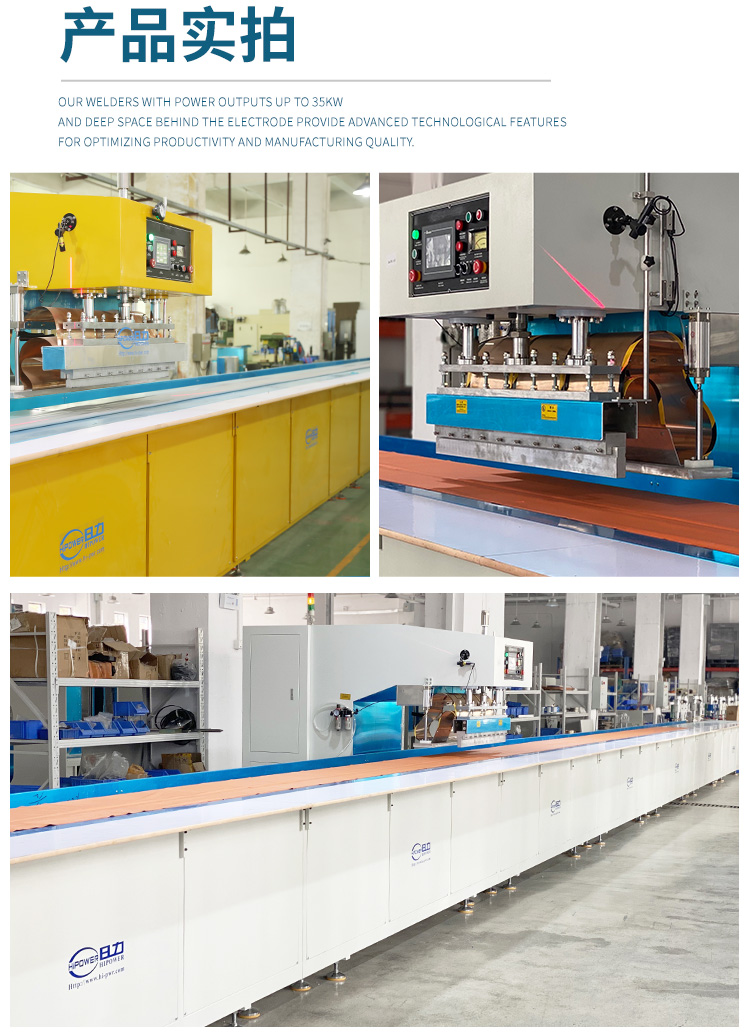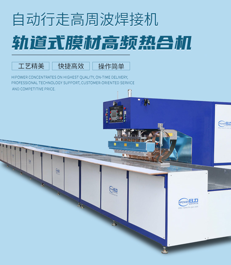 自动行走式高周波帆布熔接机的用途: 通过高周波的原理,用来做高周波PVC沼气池熔接、PVC蓄水池熔接、PVC儿童游泳池熔接,也可以用来做高周波汽车篷布帆布接驳、高周波帐篷布熔接、高周波电影幕布熔接、高周波膜结构拼接、户外膜结构焊接、膜结构熔接、高频户外遮阳布熔接、高频广告喷绘布焊接、高频PVC布熔接或含有PVC成分的任何材质的软性塑胶塑料的高周波熔接或拼接。通过高周波的作用后,被高频熔接的材料,表面光滑平整且美观牢固。 自动行走式高周波帆布熔接机的特点:※自动行走式高周波帆布熔接机,采用智能化PLC人机界面操作系统,步进或伺服马达驱动。自动行走,位置精准,无需搬动材料和机器。一条接缝一次性完成,接缝整齐,无皱纹,无刀印。每分钟可达5-10m的焊接速度。可根据用户需要,选择不同高周波功率大小的机器,每次焊接材料的长度及宽度,均可以通过改变高周波模具的尺寸长短宽度,实现膜结构或帆布的自动熔接需要。机器的内侧设有相应跨度的放料槽,放料槽的跨度和深度可根据焊接的产品大小选择。以满足不同大小面积的帆布熔接及接驳。膜结构帆布熔接机的镭射扫描定位系统为可选配置,方便每次焊接时精准定位。 ※自动行走式高周波帆布熔接机的高频振荡系统为欧式方形同轴结构,高周波输出的力量稳定强大。高周波熔接机内设有高周波NL5557火花保护系统,可防止损坏高频熔接模具。高周波膜结构熔接机的焊接时间,可根据材质厚薄不同自由设定,高周波的功率输出大小精密可调。 ※每次熔接牢固稳定,材料厚薄均可满足。机器料糟深宽,方便大面积连续接驳。机器可连续压线接熔,接熔长度可以自由定制。欧洲制式方形高频震荡箱,出力更大,更加稳定。机器为C型结构,机身至焊头跨度长达750mm。可连续压线接熔,也可以选择同时双线熔接。 ※自动行走式高周波帆布熔接机又称为高周波汽车篷布帆布接驳机、高周波帐篷布熔接机、高周波电影幕布熔接机、高周波膜结构拼接机、户外膜结构高周波焊接机、膜结构高周波熔接机、高频户外遮阳布熔接机、高频广告喷绘布焊接机、高频PVC布熔接机、高周波塑胶塑料熔接机、高周波熔接拼接机、高周波汽车篷布焊接机、高周波户外帐篷制作机、遮阳膜结构高周波焊接机、广告喷绘布高周波接驳机、高周波热汽球制造机、电影幕布高周波缝合机高周波帆布熔接机,高周波膜结构熔接机,高周波帆布机,汽车帆布熔接机。 高周波膜结构帆布熔接机的技术规格; 机 型: HR-8KWA HR-10KWA HR-12KWA HR-15KWA HR-25KWA 高 周 功 率: 8000W 10000W 12000W 15000W 25000W 电 源 电 压: 380V 50/60HZ 高 周 频 率: 27.12MHZ 13.56 MHZ 输 入 功 率: 15KVA 18KVA 20KVA 25KVA 35KVA 整 流 器: 矽二极体 振 荡 管: 7T69RB E3069 E3130 8T85RB 8T25RA 压 力: 500kg 600kg 800kg 1000kg 1500kg 电 极 间 隔: 150 mm 活 动 行 程: 150 mm 上模夹 尺寸:50*50*800mm 50*50*800mm 50*50*900mm 60*60*900mm 50*50*1000mm 熔 接 时 间: 0---10s <机器相关所有尺寸,均可根据用户要求定制。因改良需要,规格变动不另通知>
