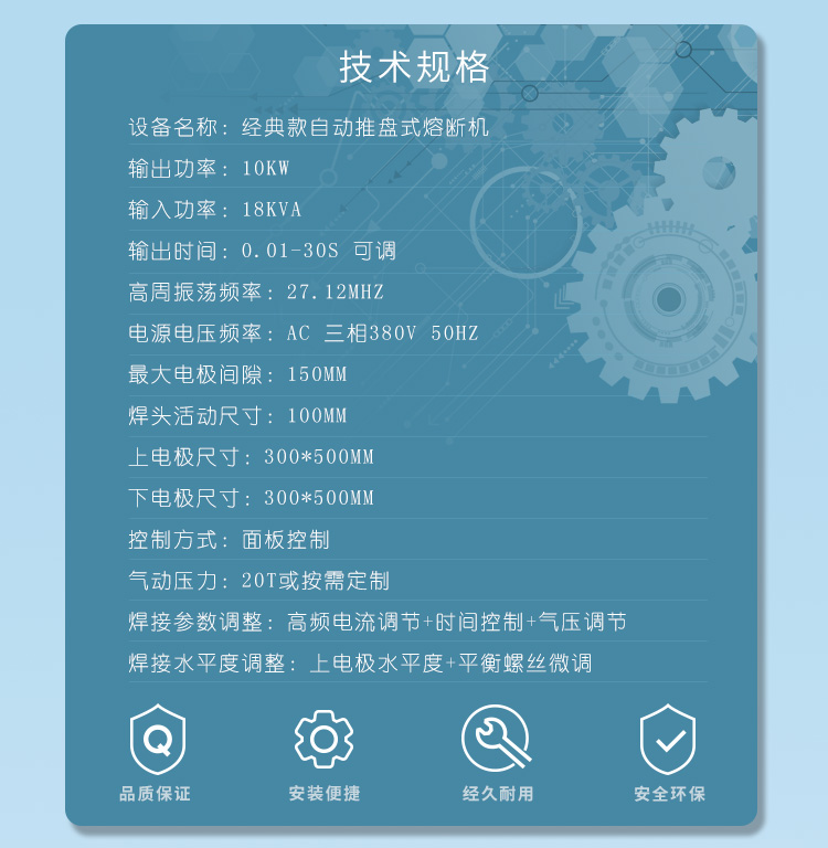 ★高周波熔断机通常分为;自动转盘式高周波熔断机(可选配机械手自动取料)、自动滑台式高周波熔断机、手动推盘式熔断机、双头式高周波熔断机、定盘式高周波同步熔断机等几种。也称为高周波熔断机、熔断机、高周波同步裁断机、高周波裁断机,本公司均有专业生产。本机采用低损耗的欧洲制式同轴高频谐振器,高周波输出电力强大,能以最迅速时间使制品熔接,大大提高生产量。