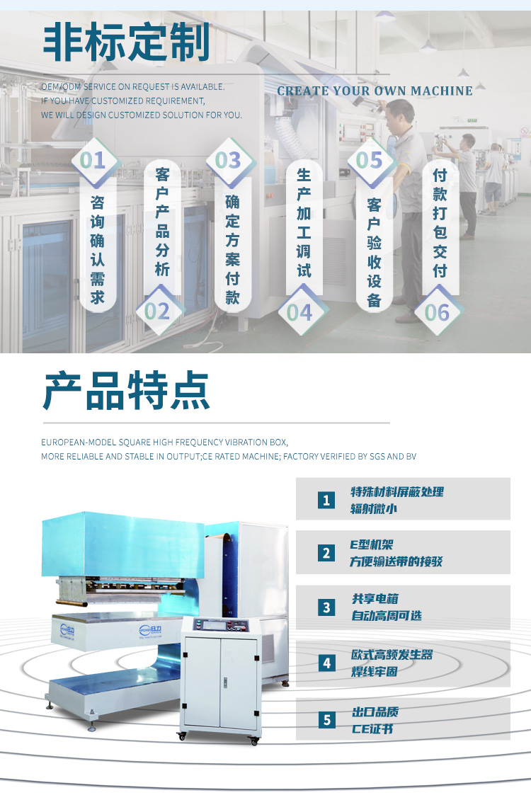 | 机器特点: | 根据产品大小,厚度设定所需振荡电流,以控制熔接程度,能保证产品熔接质量的均一性,能大大的降低熔接时间,提高机器的生产速度 |