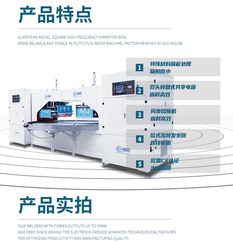 ★高周波熔接机,通常也称为高周波吸塑包装机、高周波塑料熔接机、高频热合机、高频封口机、吸塑包装机、高周波封口包装机、热合封口包装、泡壳包装机、高频热合包装机、吸塑包装机、高周波封口机、高频包装机、高周波包装机、包装机械等等。单头推盘式高周波熔接机和单头转盘式高周波熔接机有手动和自动两种可供选择,自动推盘式或自动转盘式的高周波机效率更高,产量更好。自动滑台式高周波熔接机为双向自动滑台,往返式连续送料熔接,定位准。也适用用大面积产品的加工,熔接,如PVC水床,漂流筏,儿童泳池等。