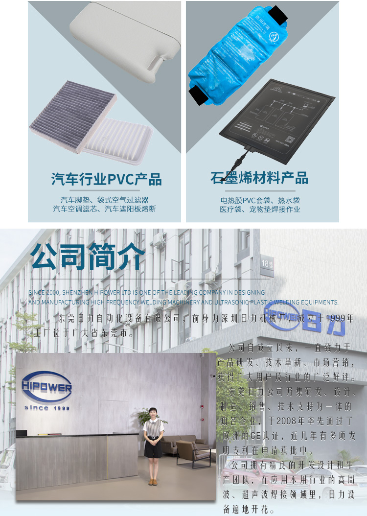 主要用于需要高周波熔接同时又必须同步裁断的产品加工,高周波机的工作原理是利用高周波先熔接再通过机器配有的压力装置同时切断。也适用于APET、PETG、GAG环保材质的双面吸塑泡壳的封口包装、吸塑纸卡包装、牙刷封口包装,以及EVA布类皮革、真皮、OPP、PU、表带、吊带、热水袋、保暖袋等需要熔接又要同步熔断的产品。