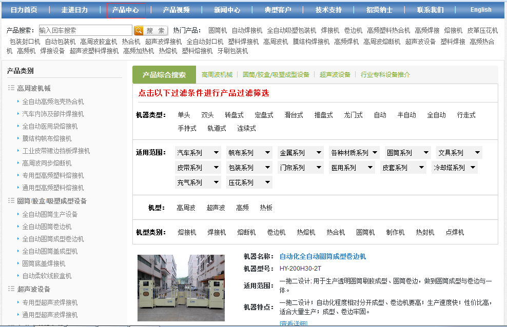 目前公司生产机型产品几百款,为方便新老用户更快更精准的检索到符合自己所需的超声波、高周波机器产品,网站推出功能强大的机械产品过滤功能,用户可点击菜单栏中的产品中心,通过机器类型、适用范围、机型、机型类别过滤出相关机型